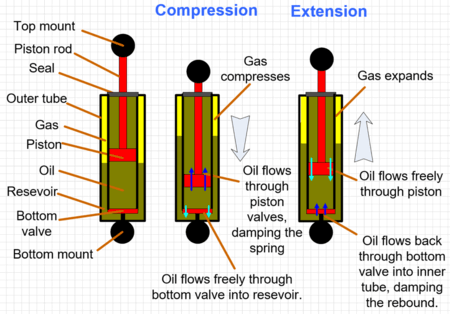 Shocks are filled with oil, and have a piston rod which goes down into the shock under compression. That rod takes up room, and as the oil is incompressible - so a shock needs something compressible inside it to account for the difference in volume between the rod fully inside the shock and fully outside. In some cases that's high-pressure nitrogen gas - hence the term "gas shocks", in other cases it's a foam cell, hence the term "foam cell shock". Gas shocks can be twin-tube or mono-tube, with the difference being whether the shock has a single tube or an inner and outer tube.